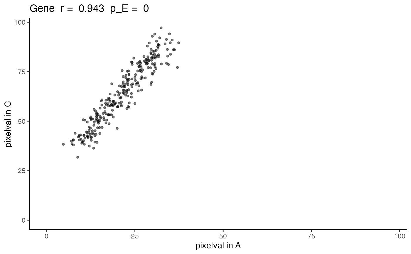 plotCorrelationGeneExp.RdFunction to calculate Pearson's correlation between rows from one SpatialExperiment dataset. To replace the analytical p-value which results in a high false positive rate for autocorrelated spatial patterns, it calculates empirical p-values from empirical null distributions generated from permuting the data and then smoothing to maintain the original degree of autocorrelation