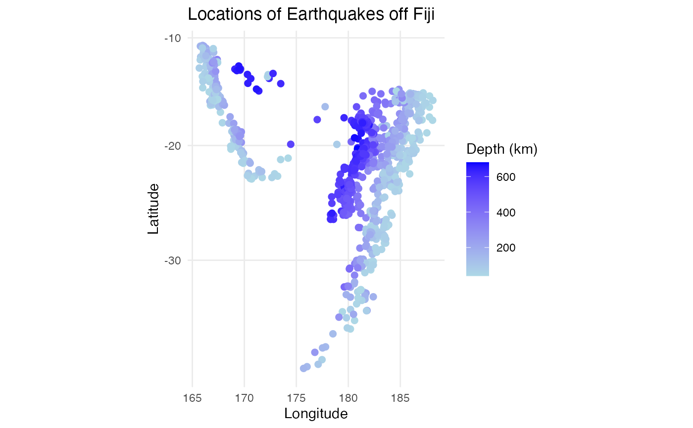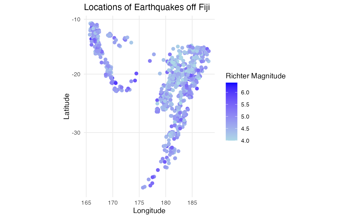 ggplot2::labs(title = "Locations of Earthquakes off Fiji",