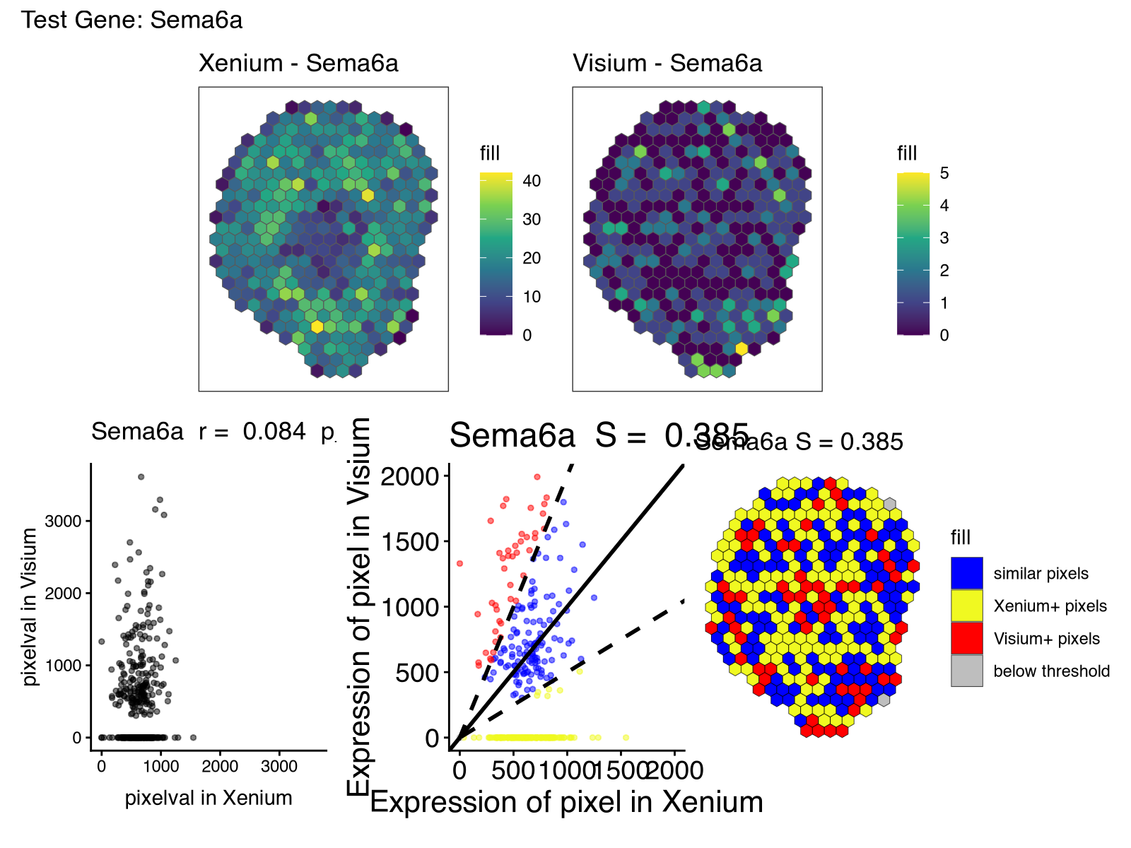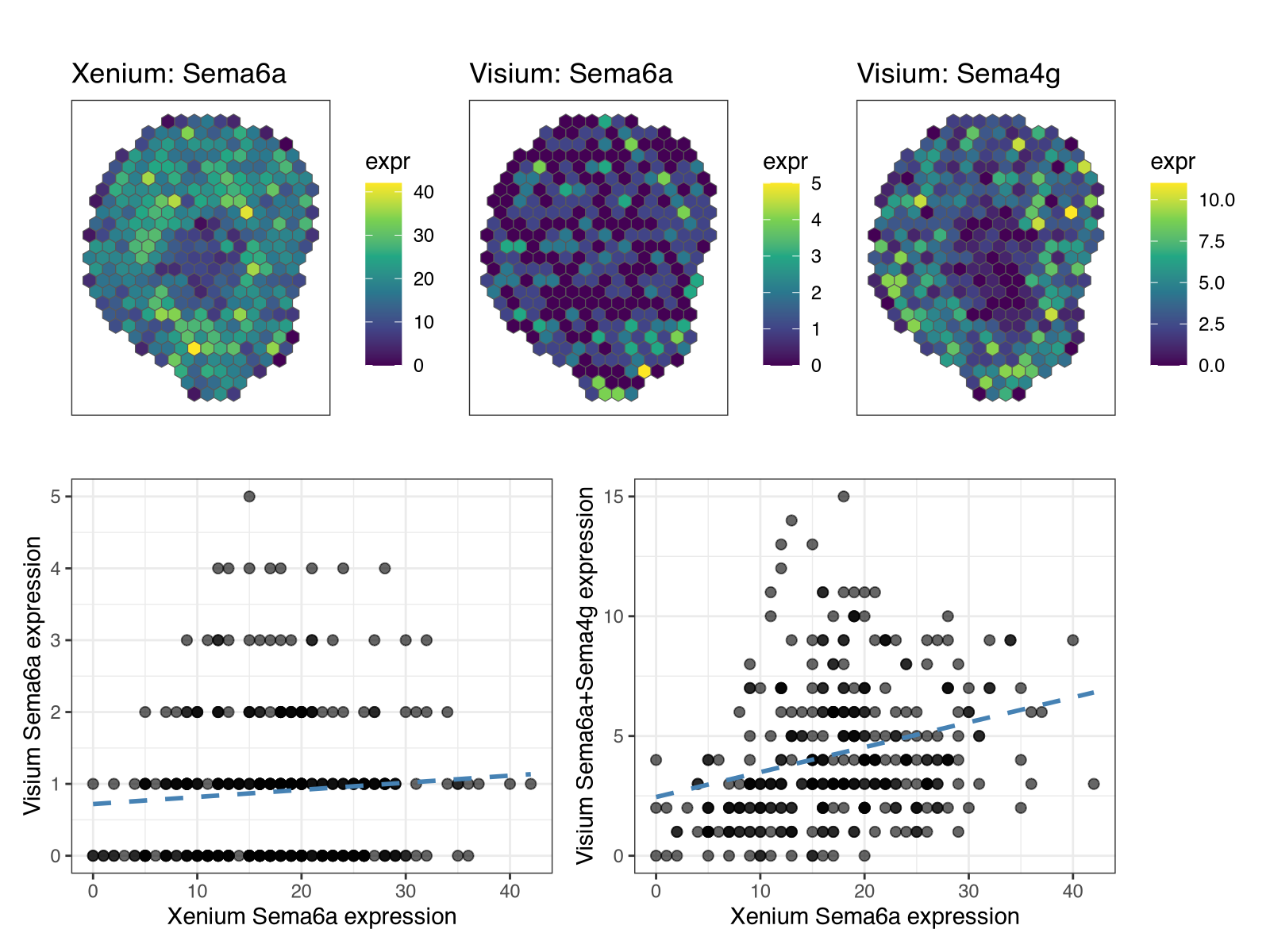 Notably, the spatial pattern of Sema4g in Visium is visually more similar to the spatial pattern of Sema6a in Xenium. Likewise, the aggregate expression of Sema4a and Sema4g in Visium across matched spatial locations is more similar to Sema6a in Xenium than Sema4g in Visium alone.
