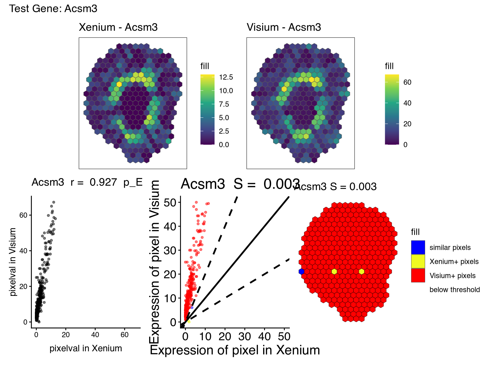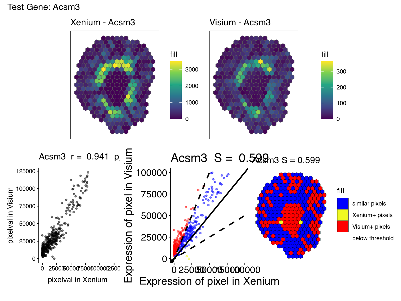 So looking through these results, I noticed how some genes like Acsm3 and others were highly consistent across the two technologies as quantified by both spatial correlation and similarity. Visually, the spatial expression pattern for this gene was effectively the same across the two serial sections, as expected.