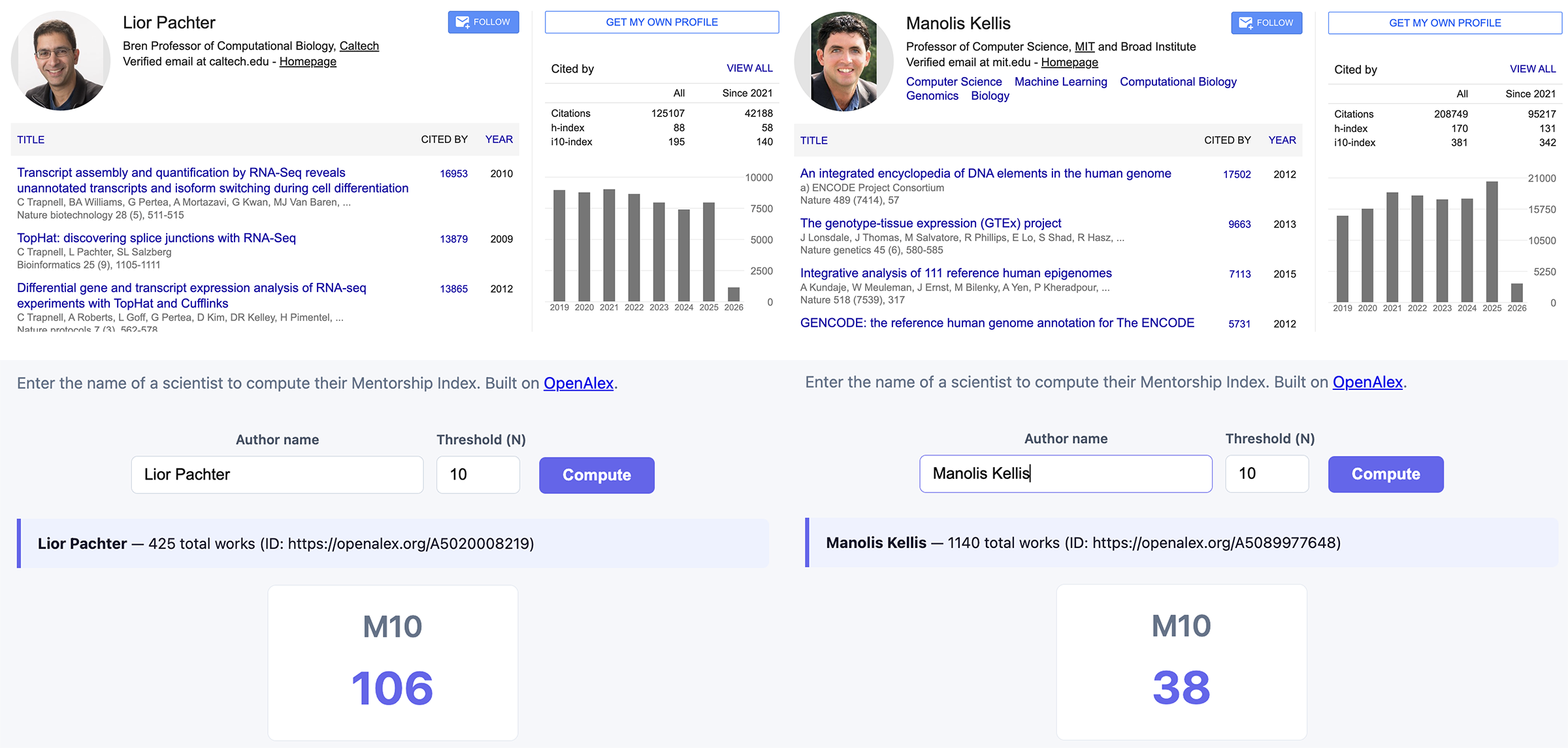 Ok, now that we’ve defined the M-index, let’s actually code it up! Better, let’s vibe code a Javascript-based web app so anyone can input in a name and calculate their M-index! Again, the web app uses the API from OpenAlex. You can check out the website at jef.works/Mentorship-Index. There’s no backend so no storage of what people search. The code is all on my lab GitHub if you’d like to fork or build on it or just take a look for yourself.